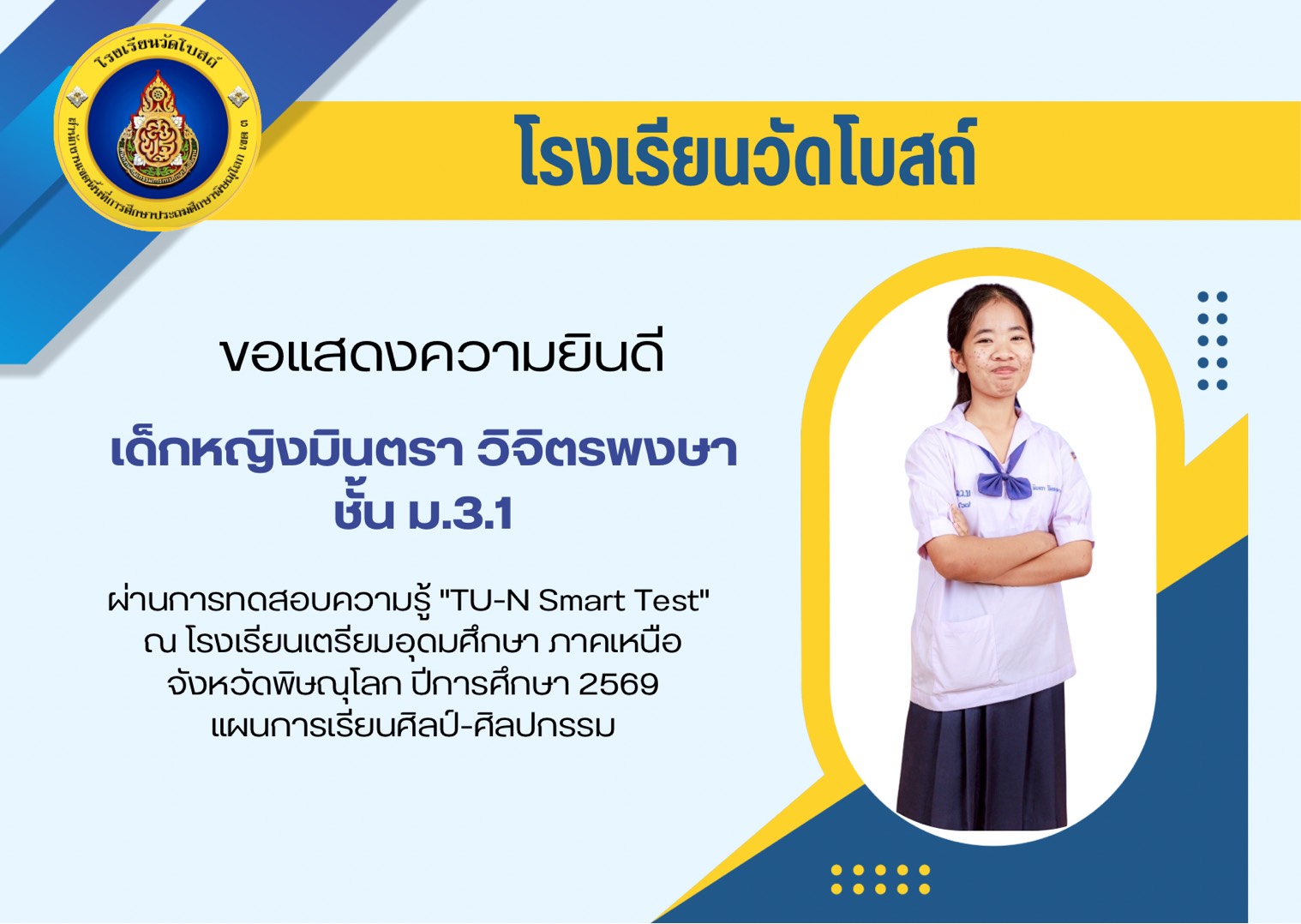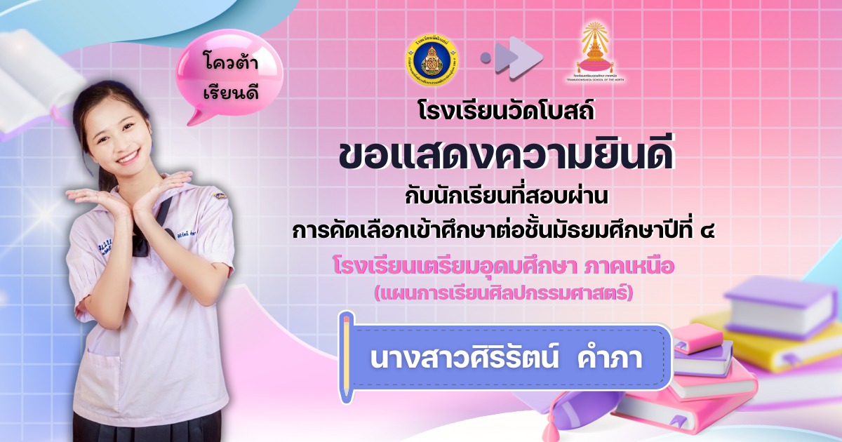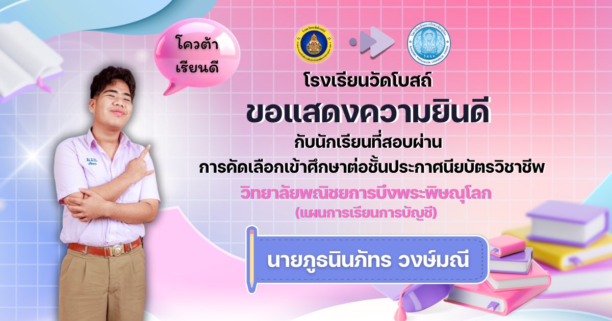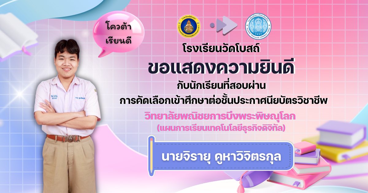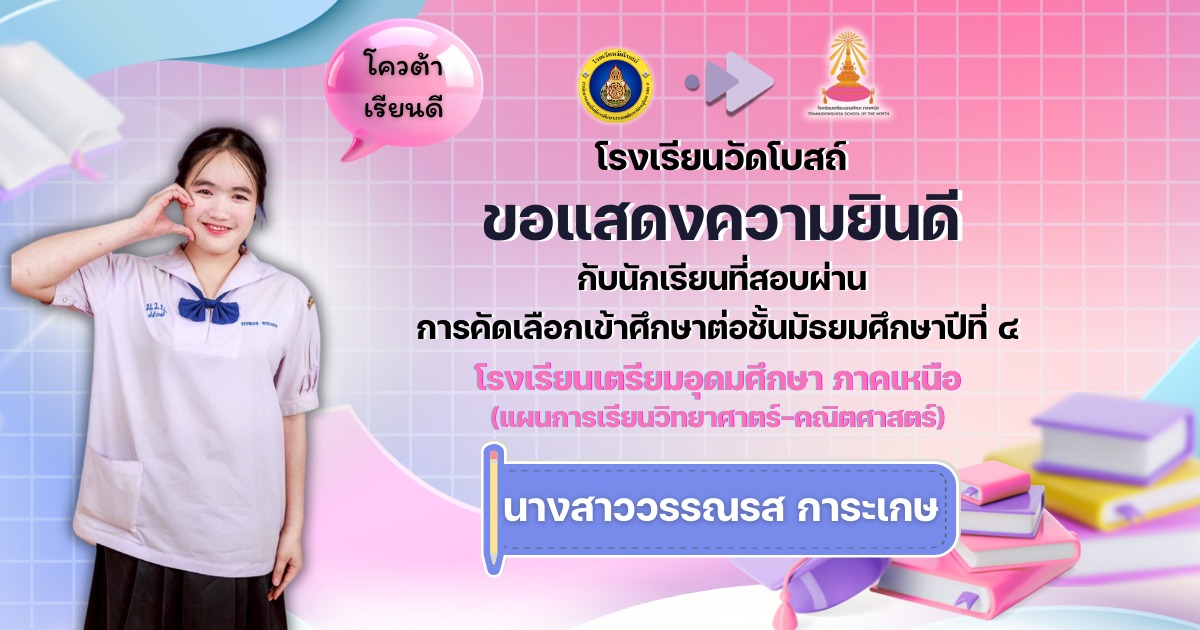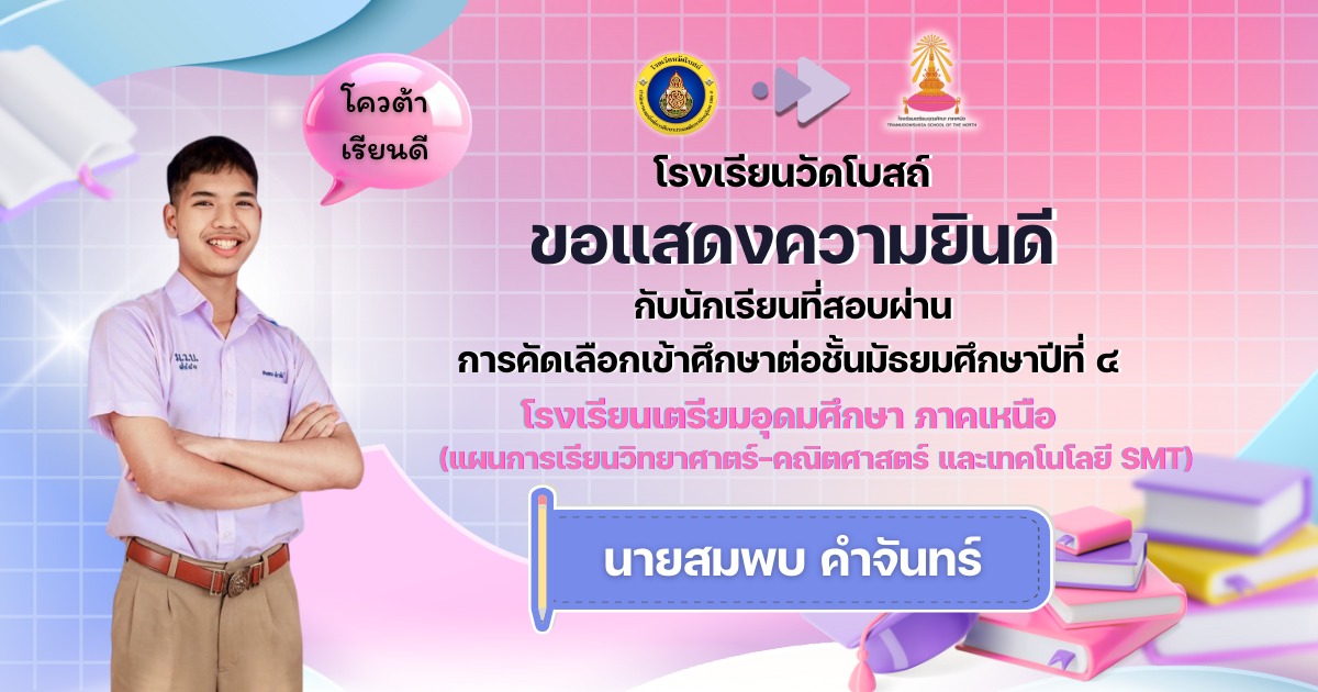 โรงเรียนวัดโบสถ์ ขอแสดงความชื่นชมและร่วมยินดีกับนักเรียนชั้นมัธยมศึกษาปีที่ 3 ทุกคน ที่ได้มุ่งมั่น วิริยะ อุตสาหะ จนสามารถ สอบผ่านการคัดเลือกเข้าศึกษาต่อ ในระดับชั้นมัธยมศึกษาปีที่ 4 และระดับอาชีวศึกษา ประจำปีการศึกษา 2569 ได้ตามที่ตั้งใจไว้