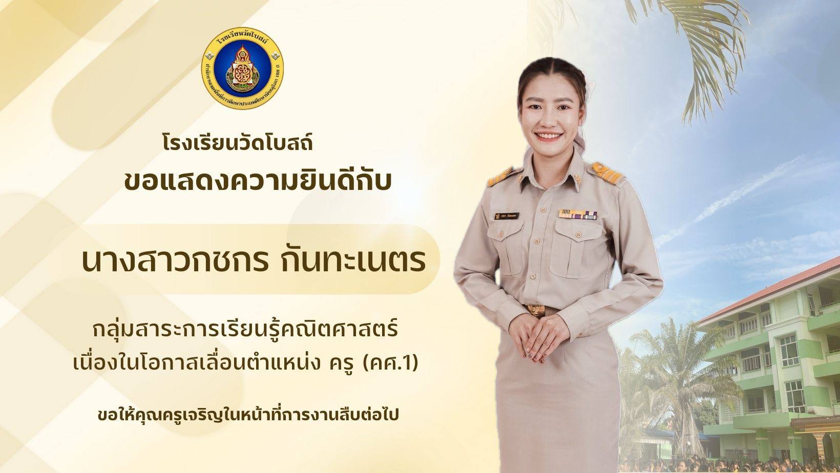 โรงเรียนวัดโบสถ์ขอแสดงความยินดีกับ นางสาวกชกร กันทะเนตร และ นางสาวจิรนันท์ ศรีทาบุตร ที่ได้เลื่อนตำแหน่งเป็น ครู (คศ.1)