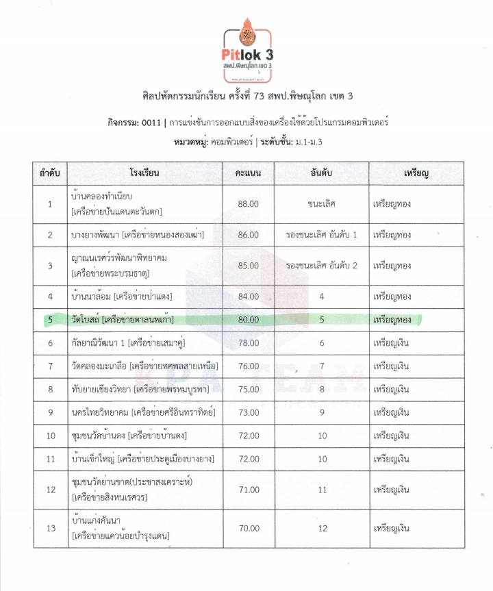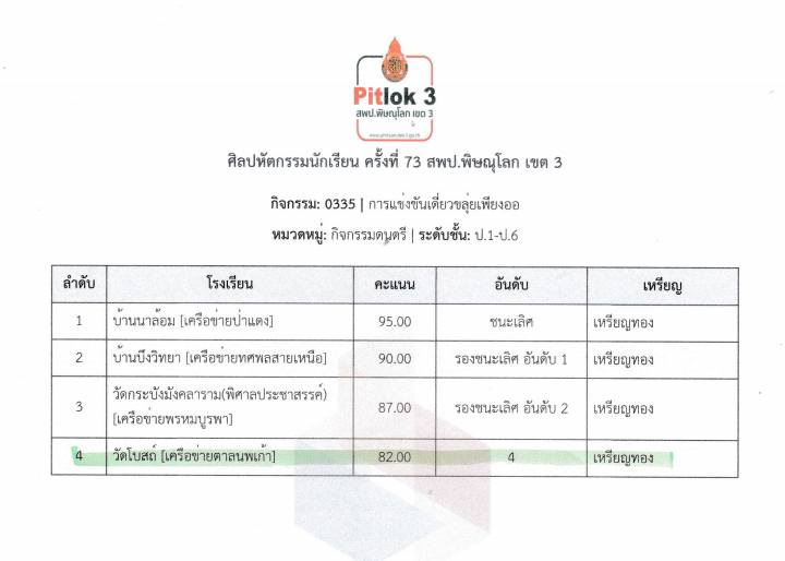 ผลการแข่งขันศิลปหัตถกรรมครั้งที่ 73 ณโรงเรียนเทศบาล 1 หนองตมศึกษา(จิ้นตง) ดังนี้