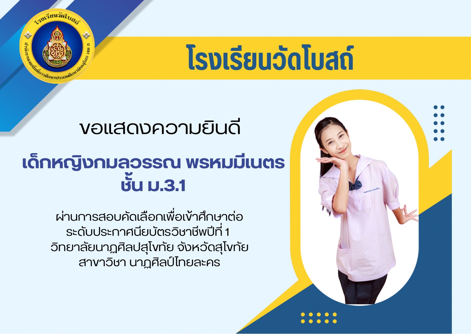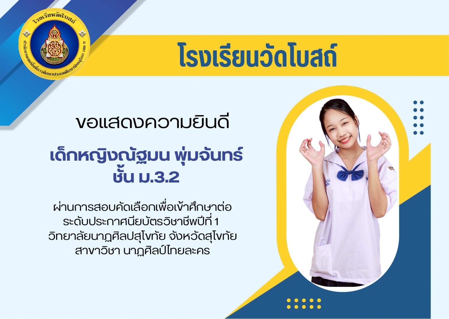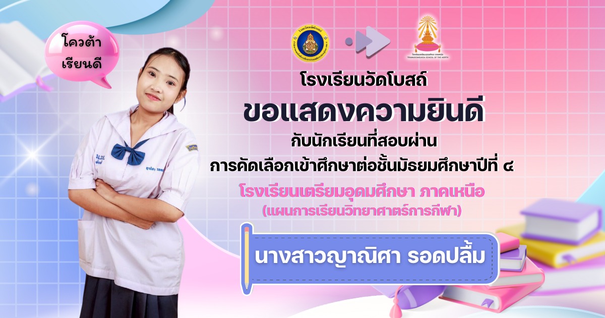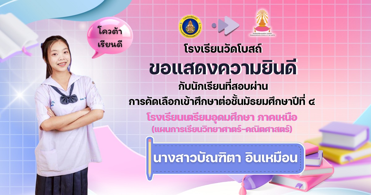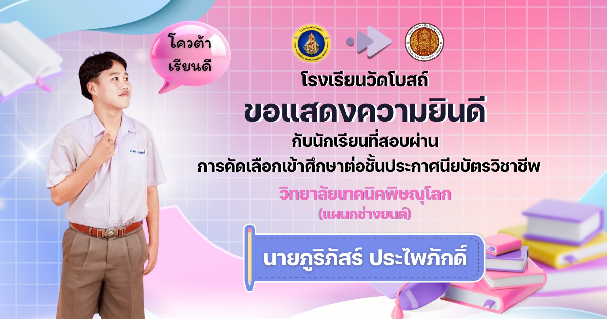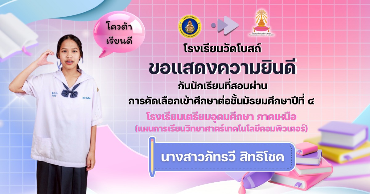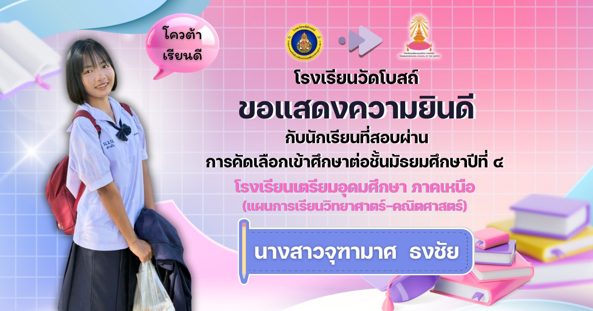 โรงเรียนวัดโบสถ์ ขอแสดงความชื่นชมและร่วมยินดีกับนักเรียนชั้นมัธยมศึกษาปีที่ 3 ทุกคน ที่ได้มุ่งมั่น วิริยะ อุตสาหะ จนสามารถ สอบผ่านการคัดเลือกเข้าศึกษาต่อ ในระดับชั้นมัธยมศึกษาปีที่ 4 และระดับอาชีวศึกษา ประจำปีการศึกษา 2569 ได้ตามที่ตั้งใจไว้